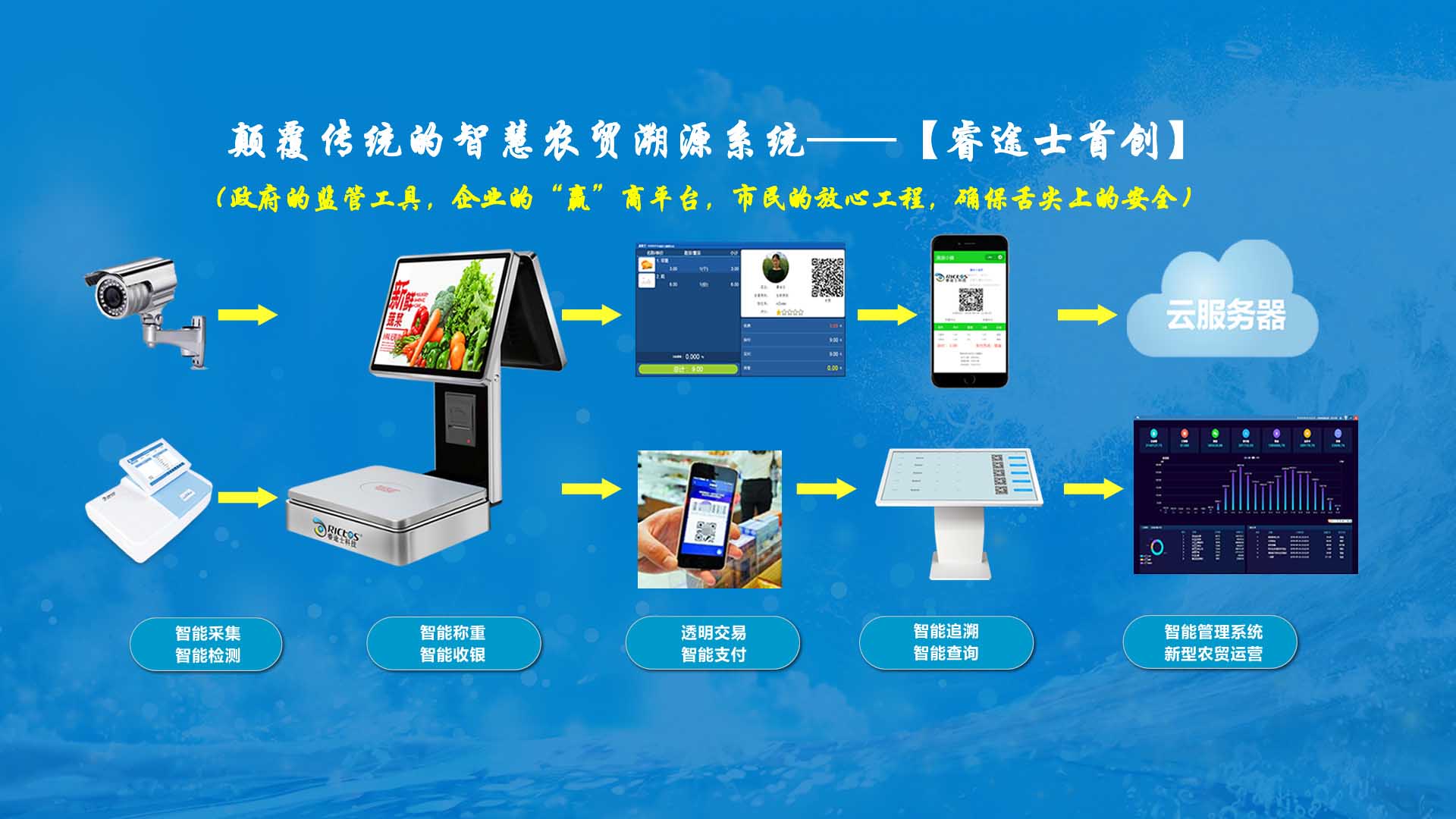 創(chuàng)新實(shí)現(xiàn)了【智慧農(nóng)貿(mào)溯源管理系統(tǒng)】與【智能稱(chēng)重收銀】一體化解決方案,集市場(chǎng)管理、運(yùn)營(yíng)管理、溯源追溯、智能收銀大數(shù)據(jù)運(yùn)用于一體,硬件、軟件與管理系統(tǒng)完美結(jié)合。適用于農(nóng)批、農(nóng)貿(mào)市場(chǎng)蔬菜、生鮮、水果、水產(chǎn)、肉類(lèi)、熟食等稱(chēng)重和非稱(chēng)重銷(xiāo)售;由于采用一體化設(shè)計(jì),解決了傳統(tǒng)農(nóng)貿(mào)市場(chǎng)無(wú)法實(shí)現(xiàn)的信息化、智能化、可追溯的管理問(wèn)題;使稱(chēng)重、收銀、追溯、管理、更透明、公正、安全,讓顧客無(wú)后顧之憂(yōu),給管理工作帶來(lái)極大的便捷與高效,對(duì)國(guó)內(nèi)農(nóng)產(chǎn)品行業(yè)的發(fā)展、農(nóng)產(chǎn)品流通管理起到了典范作用。 【睿途士首創(chuàng)】顛覆傳統(tǒng)的“智慧農(nóng)貿(mào)市場(chǎng)系統(tǒng)”,解決了傳統(tǒng)農(nóng)貿(mào)系統(tǒng)單一安卓掛屏,昂視不方便看、不直觀、無(wú)互動(dòng)性,傳輸信息不齊全、不穩(wěn)定的問(wèn)題,也解決了按鍵電子秤商品難找、商品代碼難記、按鍵操作不靈活、支付不智能,對(duì)收銀管理、銷(xiāo)售商品、菜名、菜價(jià)、打折、優(yōu)惠、會(huì)員、線(xiàn)上下單、采購(gòu)等無(wú)法實(shí)現(xiàn)實(shí)際菜品交易和追溯等問(wèn)題。 更具顛覆性的是睿途士智慧系統(tǒng)擁有三大管理平臺(tái)(市場(chǎng)管理平臺(tái)、總部運(yùn)營(yíng)管理平臺(tái)、商戶(hù)后臺(tái)管理平臺(tái))、一個(gè)可視操作前臺(tái)和三大追溯功能,讓遠(yuǎn)程管理、數(shù)據(jù)傳輸、人機(jī)互動(dòng)、智能控制、移動(dòng)支付、大數(shù)據(jù)、互聯(lián)通信、云端存儲(chǔ)、人工智能、智能城市、電子定位、智能收銀等功能得以實(shí)現(xiàn)。